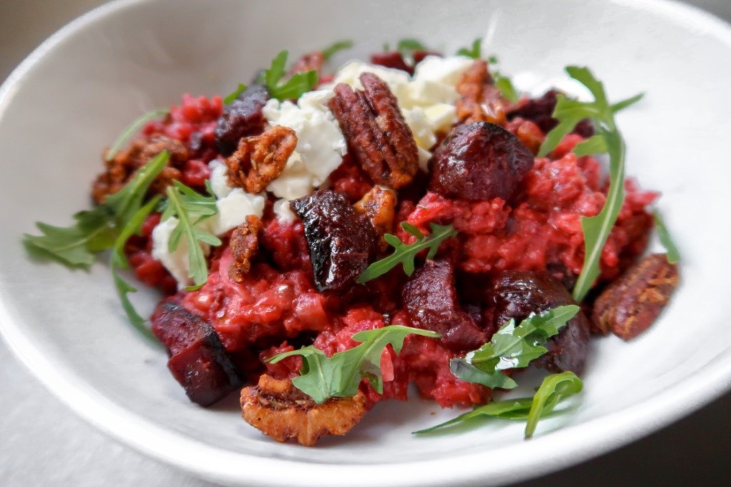 To get the ruby colouring, some of the beetroot is puréed and mixed in while the risotto is still being cooked. The rest of the beetroot is roasted in the oven which intensifies the flavour and gives it a smokey depth.