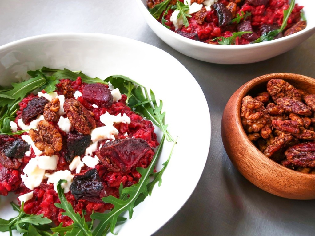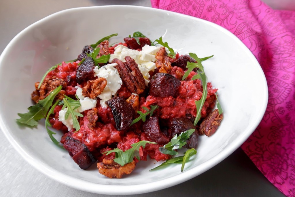 The colours of this beetroot risotto, is reminiscent of Christmas with the green of the arugula in stark contrast to the beautiful red hue of the beetroot. But what elevates this bright beetroot risotto to the next level is the variety of textures and complementary flavours in each bite. The cumin-spiced nuts work so well with the roasted beetroot and salty feta.